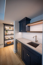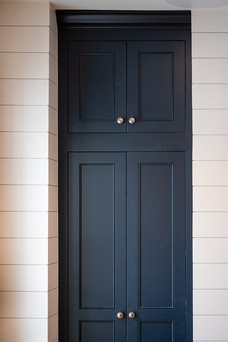 Remember the dark blue mudroom lockers in the main level back entry? We brought that stunning hue to the kids' space for a playful bold look against the bright white of the shiplap.